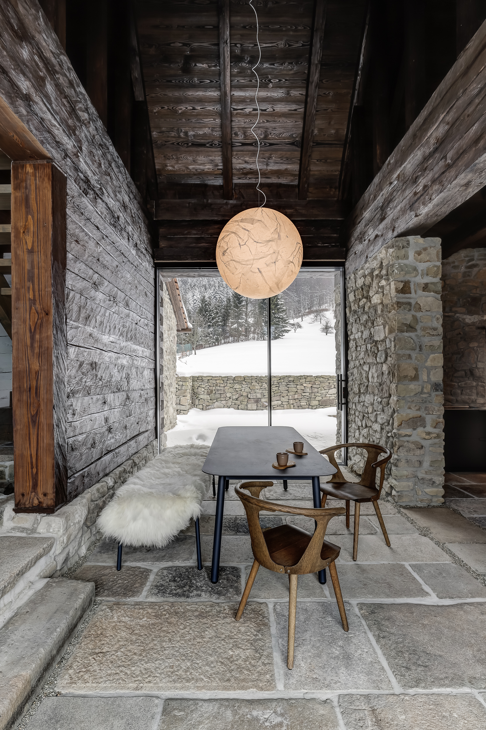 Chalupa má dvě roubené ložnice, kamennou koupelnu a pak jeden velký plynoucí prostor, který přechází z velkorysého obýváku přes prosklenou jídelnu z bývalého průjezdu do kuchyně vestavěné do starého chléva. Kamenná dlažba je stejná tady uvnitř i na terase – aby interiér i exteriér byly propojeny a aby prostor neměl konce.
